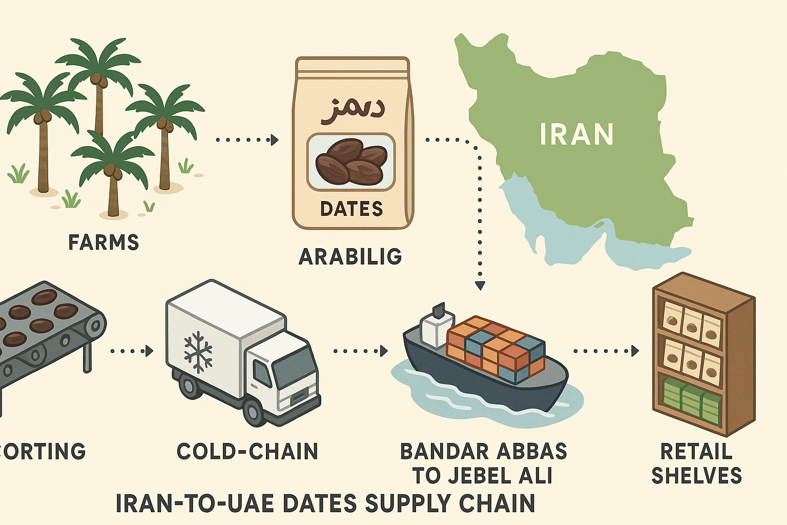 با نزدیکشدن به رمضان ۲۰۲۵ (شروع ۱ مارس)، خردهفروشیهای امارات سفارشهای خرما را از اوایل زمستان بالا بردهاند و تمرکز ویژهای بر تنوع رقمها و صحت برچسب عربی دارند. برای تولیدکنندگان ایرانی، برنامهریزی دقیق حمل، بستهبندی استاندارد و درج «تاریخ تولید/مصرف» مطابق الزامات امارات، شرط ورود پایدار به قفسههای دبی و ابوظبی است.